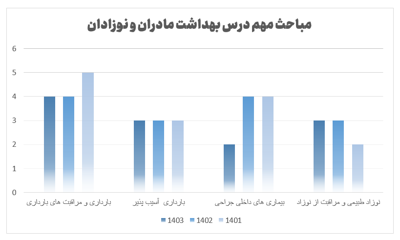 در تصویر زیر، تقسیم بندی سوالات سه سال اخیر کنکور ارشد پرستاری رو برای چهار تا از مهم ترین مباحث درس بهداشت مادران و نوزادان مشاهده می کنید. همانطور که مشاهده می کنید، این چهار فصل به طور میانگین 10 سوال رو در کنکور ارشد به خودشون اختصاص دادن که درصد قابل توجهی از این درس هست.
